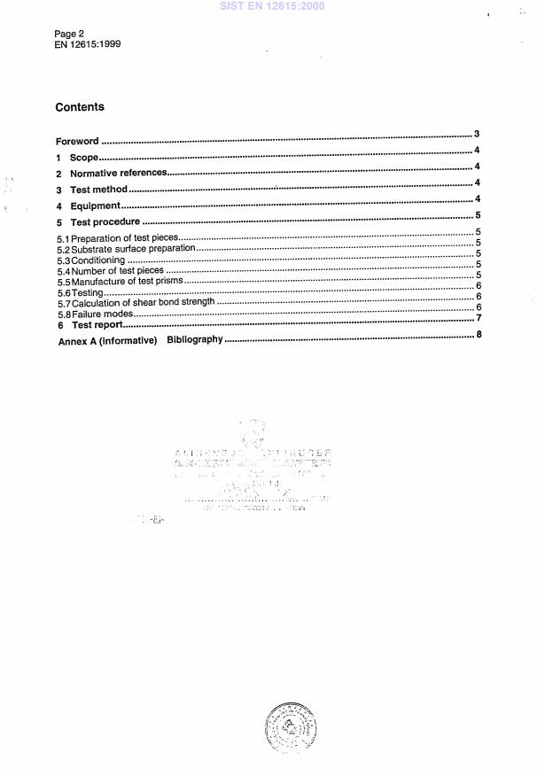 Keywords: EN 12615:1999, slant shear strength test, concrete bond strength, concrete repair, structural bond, hardened concrete, fresh concrete, concrete substrates, concrete protection standards, CEN standards, concrete testing methods