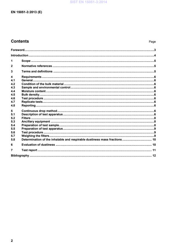 Ta evropski standard določa preskus trajnega padanja in povezane preskusne metode za ponovljivo pridobitev prahu iz razsutih materialov v standardnih pogojih in merjenje vdihljivih in respiratornih deležev prahu z upoštevanjem obstoječih evropskih standardov, kjer je ustrezno. Namen metode trajnega padanja je simulacija postopkov nastajanja prahu, kjer pride do trajnega padanja (prenos, razlaganje, polnjenje, ponovno polnjenje, tehtanje, odstranjevanje, merjenje, nalaganje, razkladanje itd.) in kjer se prah med padanjem preseje. Metodo je mogoče prilagoditi tudi za merjenje torakalne funkcije, vendar ta evropski standard ne opisuje te prilagoditve. Razlikuje se od metode z vrtečim bobnom, predstavljene v standardu EN 15051-2. Po tem evropskem standardu razsuti material pade na tla enkrat, medtem ko se po standardu EN 15051-2 razsuti material večkrat spusti na tla. Ta evropski standard navaja tudi okoljske pogoje, ravnanje z vzorci in analitične postopke ter metodo izračuna in predstavitve rezultatov. Določena je razvrstitvena shema prašnosti za zagotovitev standardiziranega načina izražanja in sporočanja rezultatov uporabnikom razsutih materialov. Ta evropski standard se uporablja za razsute materiale v prahu, granulah in peletih. Ta evropski standard se ne uporablja za preskušanje sproščanja prahu med mehanskim obdelovanjem trdnih razsutih materialov (npr. rezanje, drobljenje) ali za ocenjevanje postopkov ravnanja z razsutimi materiali.