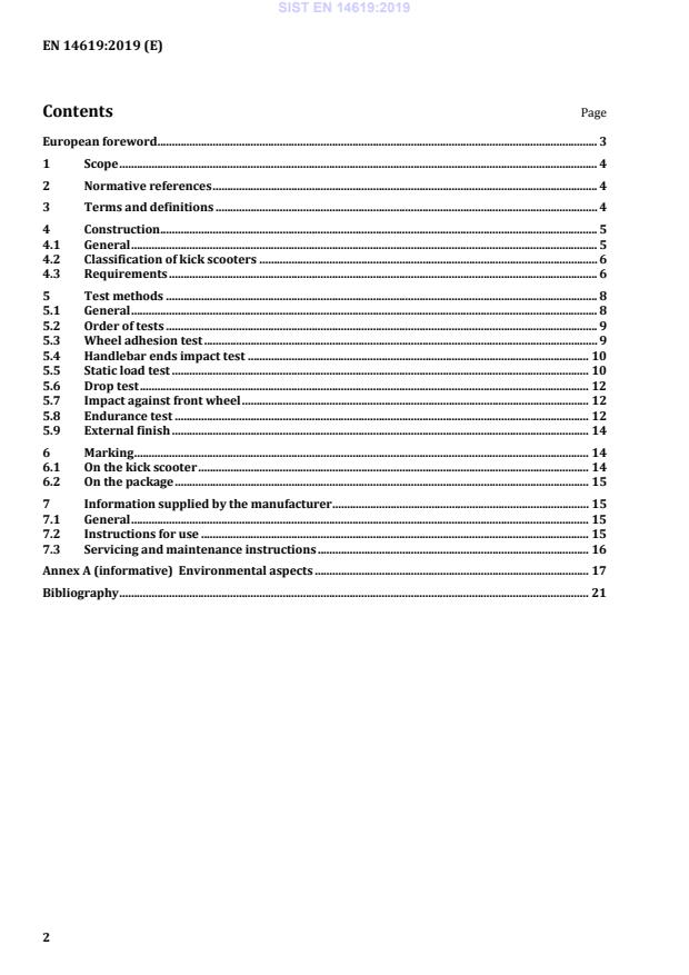 EN 14619:2019 is a standard published by the European Committee for Standardization (CEN). Its full title is "Roller sports equipment - Kick scooters - Safety requirements and test methods". This standard covers: This document applies to kick scooters that can only be propelled by the muscular activity of a user with a body mass of more than 20 kg and less than 100 kg. To reduce the risk of injuries to both the user and third parties during intended use this standard specifies safety requirements, test methods, marking, and information supplied by the manufacturer. Kick scooters for use by users of less than 20 kg do not belong to the scope of this document. They are toys. It should be noted that there are two types of scooters for the weight group 20 kg to 50 kg – those classified as sports equipment for use on public roads and path ways (this European Standard) and those classified as toys for domestic use (according to EN 71-1).