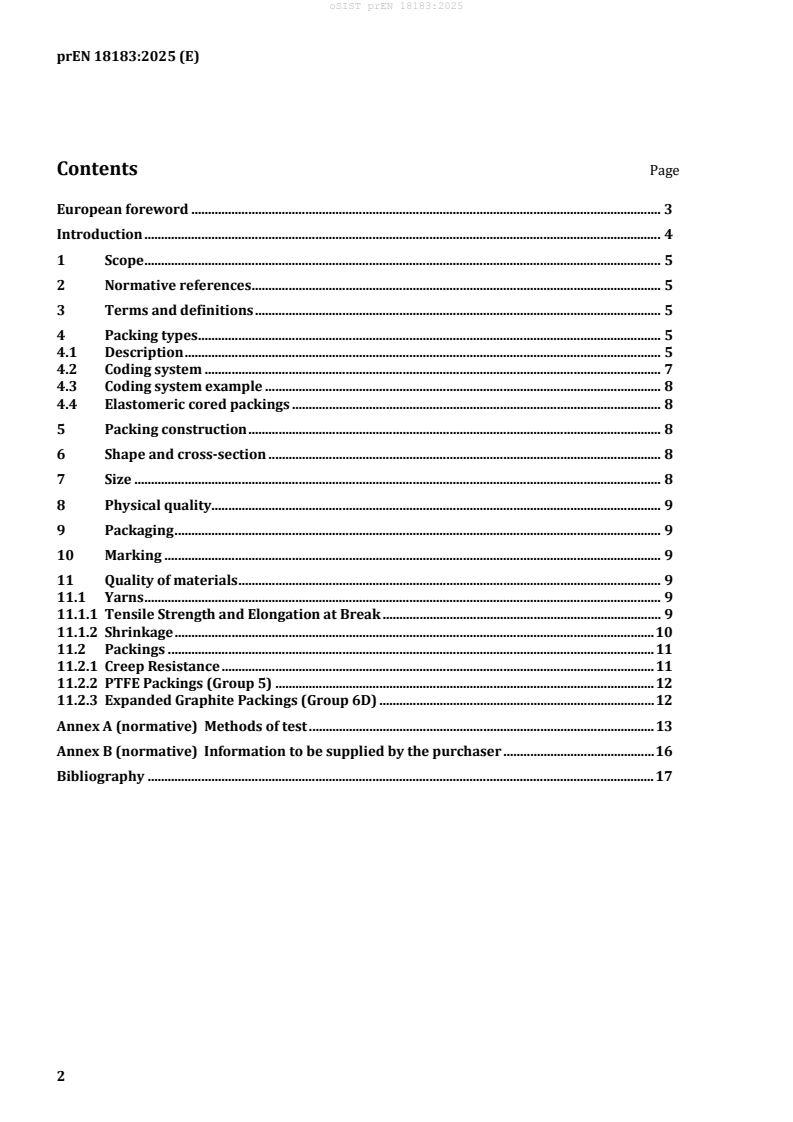 prEN 18183 is a draft published by the European Committee for Standardization (CEN). Its full title is "Pumps - Specification for Gland Packings manufactured from Yarns and Ribbons". This standard covers: This document provides a method of describing the materials, impregnates and lubricants for various types of yarn and ribbon based packings intended for use as gland seals in mechanical equipment such as pumps, mixers, etc. It does not include similar products intended for other duties such as thermal insulation. Guidance is also given regarding dimensional and physical quality aspects of the packings and requirements for packaging and marking. Tests are specified for the determination of lubricant content, size and mass. NOTE 1 The information supplied by the purchaser at the time of enquiry and/or order is given in Annex B. NOTE 2 All packings are free from introduced asbestos fibres in conformance with Annex XVII of REACH.