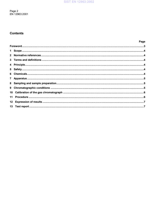 Page 2EN 12963:2001ContentsPageForeword.31Scope.42Normative references.43Terms and definitions.44Principle.45Safety.46Chemicals.47Apparatus.58Sampling and sample preparation.59Chromatographic conditions.510Calibration of the gas chromatograph.611Procedure.612Expression of results.713Test report.7SIST EN 12963:2002