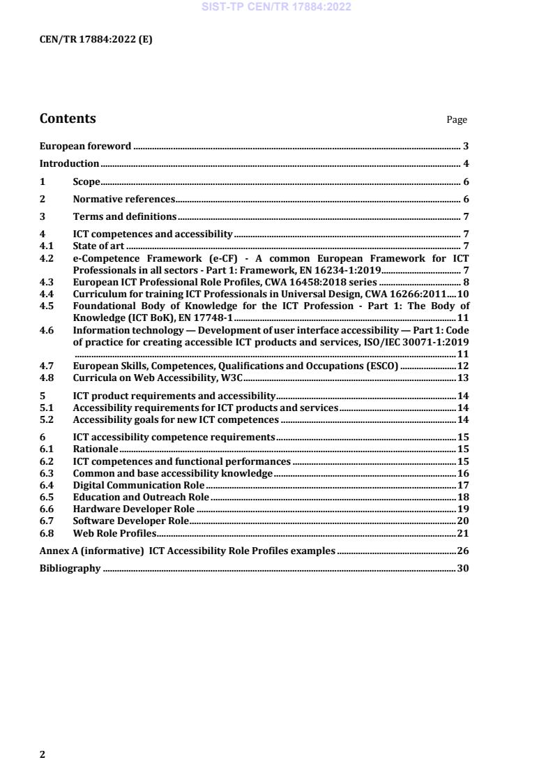 CEN/TR 17884:2022 is a technical report published by the European Committee for Standardization (CEN). Its full title is "ICT accessibility competences - Guidelines for a more inclusive ICT development". This standard covers: This document specifies the knowledges, skills, responsibility and autonomy of ICT experts involved in the development of products and services (including digital contents) to increase the accessibility knowledge in different fields, for different competences and responsibilities. This document: — considers accessibility as "base line" (accessibility has been also recognized in EN 16234-1:2019 as a Transversal aspect); — recognizes accessibility as the requirement in procurement for both public and private sectors; — provides an overview of useful CEN, ISO and ESCO publications in the field; — defines a set of knowledges, skills, responsibility and autonomy for different ICT areas to improve accessibility in the current professional roles and job positions (hardware, software, web); — refers to ESCO ICT profiles, that can be adapted for the three main areas: hardware, software, web; — refers to W3C activities for define knowledges, skills, responsibility and autonomy in web accessibility role profiles; — supports activities for educational providers and exam/certification institutes. This document should help, for example, to: — avoid issues on the definition of third level profiles derived from European ICT Professional Role Profiles without missing accessibility requirements; — enable easy application of accessibility related EU-level standards and references from CEN, ISO and ESCO; — allow the market to adapt their current job profiles and/or training courses adding the accessibility skills. This document supports the definition of knowledge and skills for each ICT professional role without creating new ICT role profiles which includes accessibility competences.