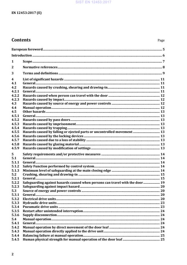 Trained users (public not likely to be present) Type 1 Trained users (public likely to be present) Type 2 Untrained users Type 3 Hold-to-run control mode of operation A B Not possible Impulse activation in sight of the door C or E C or E C and D, or E Impulse activation out of sight of the door C or E C and D, or E C and D, or E Automatic control C and D, or E C and D, or E C and D, or E In sight of the door is from a position that allows full, direct and permanent real-time view of the door at activation and during the entire movement. 5.2 Crushing, shearing and drawing-in 5.2.1 General 5.2.1.1 General Hazards listed in 4.2 shall be avoided by design and construction. When this cannot be achieved they shall be safeguarded up to a height of 2,5 m above the floor or any other permanent access level. This can be achieved by one or a combination of the following measures: — creating safety distances (see 5.2.1.2); — installing guards such as enclosures, covers, enclosing guards, fixed protection leaves (see 5.2.1.3); — shaping and profiling the leaf surfaces and any protruding parts so as to prevent injury (see 5.2.1.4); — operating the door in the hold to run control mode (see 5.2.1.5); SIST EN 12453:2017