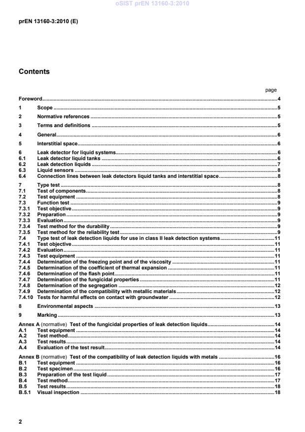 prEN 13160-3 rev is a draft published by the European Committee for Standardization (CEN). Its full title is "Leak detection systems - Part 3: Liquid systems for tanks". This standard covers: This European Standard specifies the requirements for leak detection systems – class II for use with doubleskin tanks designed for water polluting fluids.