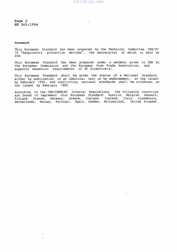 - EN 269:1994 is a CEN standard; users should consult other relevant CEN/ISO standards on respiratory protective devices for additional guidance on fit, performance classes, and complementary test methods. Note that EN 269 does not cover escape, diving, or abrasive blasting apparatus - such devices are addressed by separate standards.