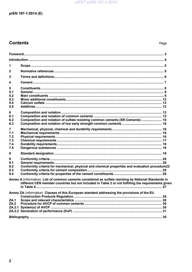 Diese Europäische Norm legt die Eigenschaften und Anforderungen von 35 unterschiedlichen Normalzementen, sieben Normalzementen mit hohem Sulfatwiderstand, drei unterschiedlichen Hochofenzementen mit niedriger Anfangsfestigkeit und zwei Hochofenzementen mit niedriger Anfangsfestigkeit und hohem Sulfatwiderstand sowie ihren Bestandteilen fest. Die Definition jeder Zementart enthält die Anteile der Bestandteile, die erforderlich sind, um diese verschiedenen Produkte in neun Festigkeitsklassen herzustellen. Die Definition enthält auch die Anforderungen, die die Bestandteile erfüllen müssen, sowie die Anforderungen an die mechanischen, physikalischen und chemischen Eigenschaften. Darüber hinaus enthält diese Norm die Konformitätskriterien und die damit verbundenen Regeln sowie die erforderlichen Anforderungen an die Dauerhaftigkeit.