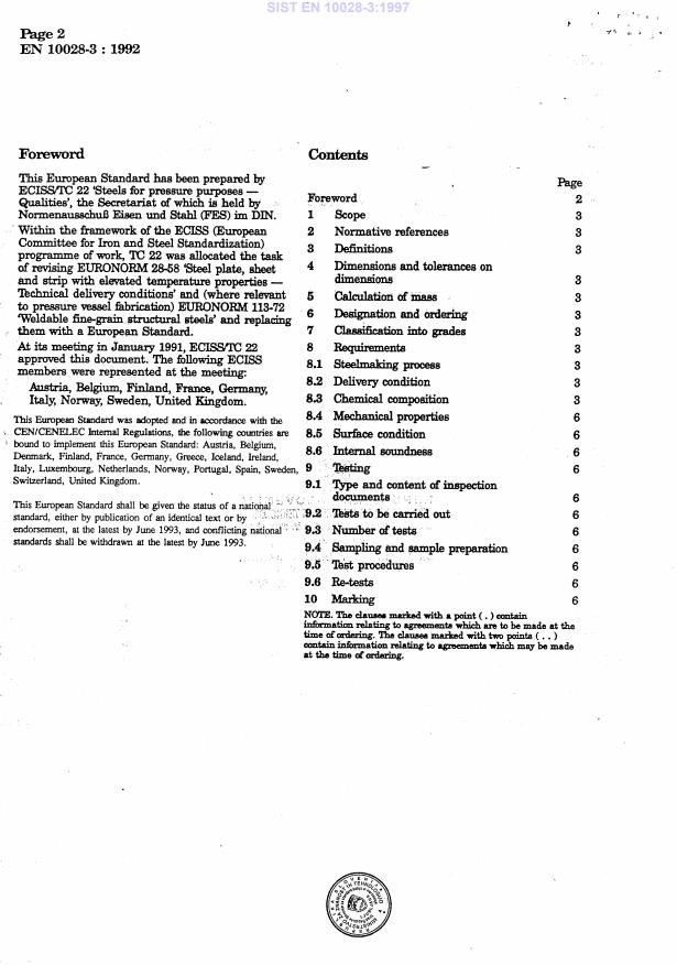 EN 10028-3:1992 is a standard published by the European Committee for Standardization (CEN). Its full title is "Flat products made of steels for pressure purposes - Part 3: Weldable fine grain steels, normalized". This standard covers: 1.1 This Part 3 of EN 10028 specifies requirements for flat products for pressure purposes made of weldable fine grain steels as listed in table 1. NOTE: Fine grain steels' are understood to mean steels which accordance with EURONORM 103 1.2 The requirements of EN 10028-1 also apply.