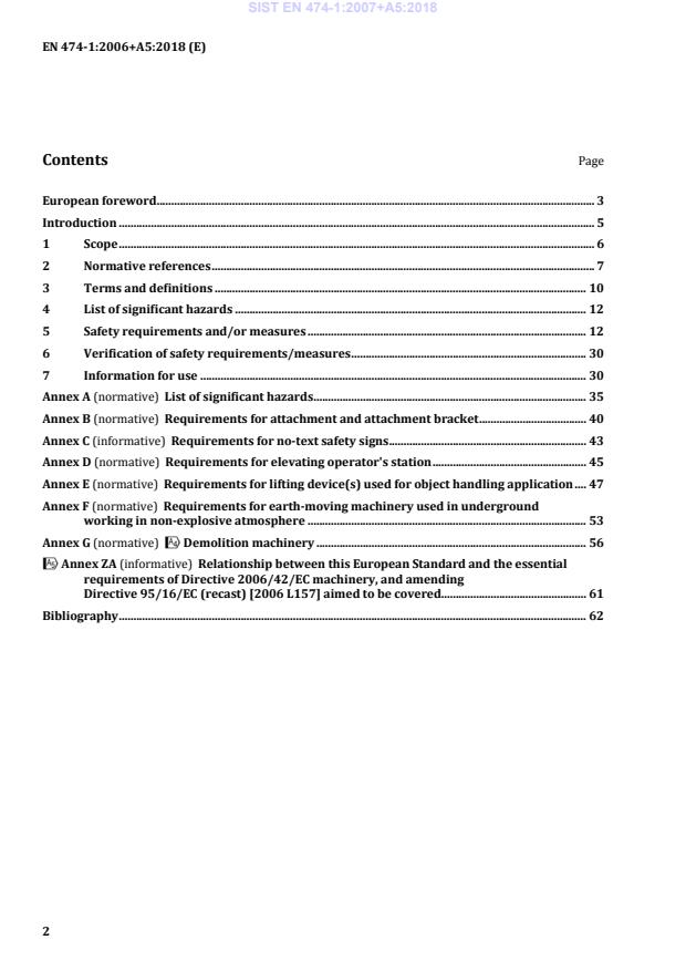 The modifications of the related CEN Corrigendum have been implemented at the appropriate places in the text and are indicated by the tags ˜™. This document has been prepared under a mandate given to CEN by the European Commission and the European Free Trade Association, and supports essential requirements of EU Directive. !For relationship with EU Directive(s), see %informative Annex ZA&, which is an integral part of this document." EN 474 "Earth-moving machinery — Safety" comprises the following parts: — Part 1: General requirements — Part 2: Requirements for tractor-dozers — Part 3: Requirements for loaders — Part 4: Requirements for backhoe-loaders — Part 5: Requirements for hydraulic excavators — Part 6: Requirements for dumpers — Part 7: Requirements for scrapers — Part 8: Requirements for graders — Part 9: Requirements for pipe-layers — Part 10: Requirements for trenchers SIST EN 474-1:2007+A5:2018