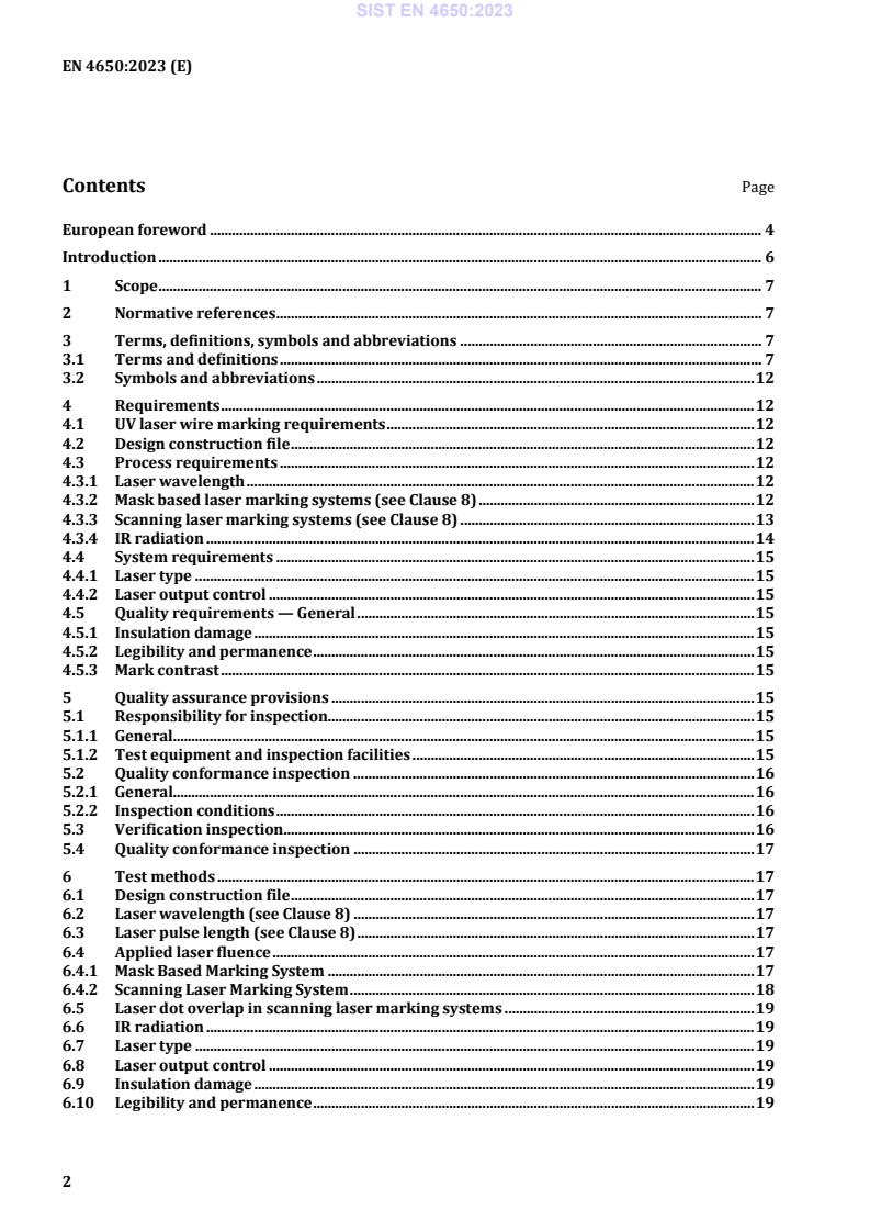 EN 4650:2023 is a standard published by the European Committee for Standardization (CEN). Its full title is "Aerospace series - Wire and cable marking process, UV Laser". This standard covers: This document is applicable to the marking of aerospace vehicle electrical wires and cables using ultraviolet (UV) lasers. This document specifies the process requirements for the implementation of UV laser marking of aerospace electrical wire and cable and fibre optic cable to achieve an acceptable quality mark using equipment designed for UV laser wire marking of identification codes on aircraft wire and cable subject to EN 3475-100, Aerospace series - Cables, electrical, aircraft use - Test methods - Part 100: General. Wiring specified as UV laser markable and which has been marked in accordance with this document will conform to the requirements of EN 3838. This document is applicable to the marking of airframe electrical wires and cables using ultraviolet (UV) lasers. The laser process practices defined in this document are mandatory.