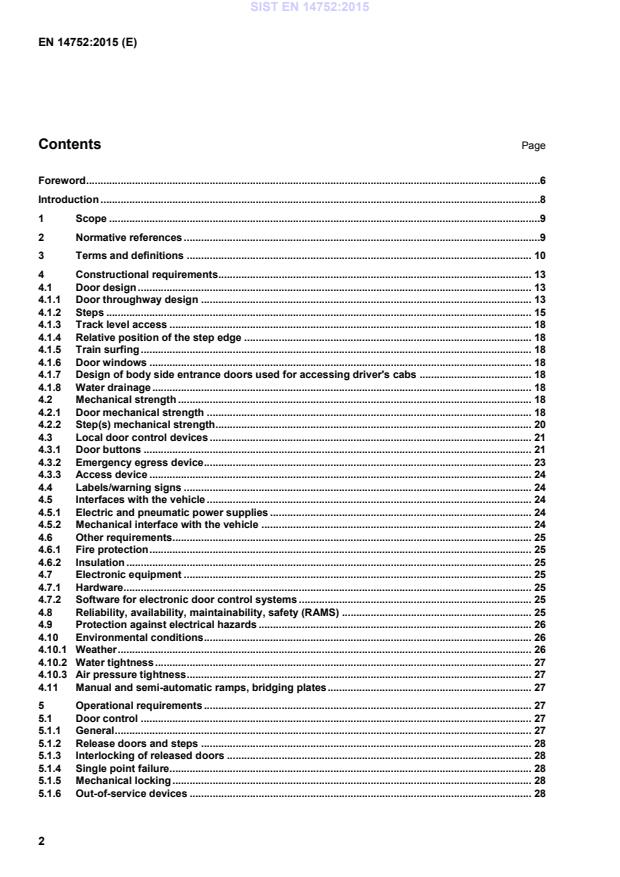 added 5.2.1.3 Closing and opening warning rewritten 5.2.1.4.2.2 Closing force force over whole door travel defined 5.2.1.4.2.3 Kinetic energy added 5.2.1.4.2.4 Non-contact obstacle detection added 5.2.1.5 Anti drag added 5.4 Moveable step obstacle detection rewritten A.2 Design of door buttons updated D.1 General new issue Annex I added Annex J added Annex K added Annex ZA updated NOTE: The technical changes referred to include the significant technical changes from the EN revised but are not an exhaustive list of all modifications from the previous edition. This document has been prepared under a mandate given to CEN by the European Commission and the European Free Trade Association, and supports essential requirements of EU Directive 2008/57/EC. For relationship with EU Directive(s), see informative Annex ZA, which is an integral part of this document. According to the CEN-CENELEC Internal Regulations, the national standards organizations of the following countries are bound to implement this European Standard: Austria, Belgium, Bulgaria, Croatia, Cyprus, Czech Republic, Denmark, Estonia, Finland, Former Yugoslav Republic of Macedonia, France, Germany, Greece, Hungary, Iceland, Ireland, Italy, Latvia, Lithuania, Luxembourg, Malta, Netherlands, Norway, Poland, Portugal, Romania, Slovakia, Slovenia, Spain, Sweden, Switzerland, Turkey and the United Kingdom. SIST EN 14752:2015