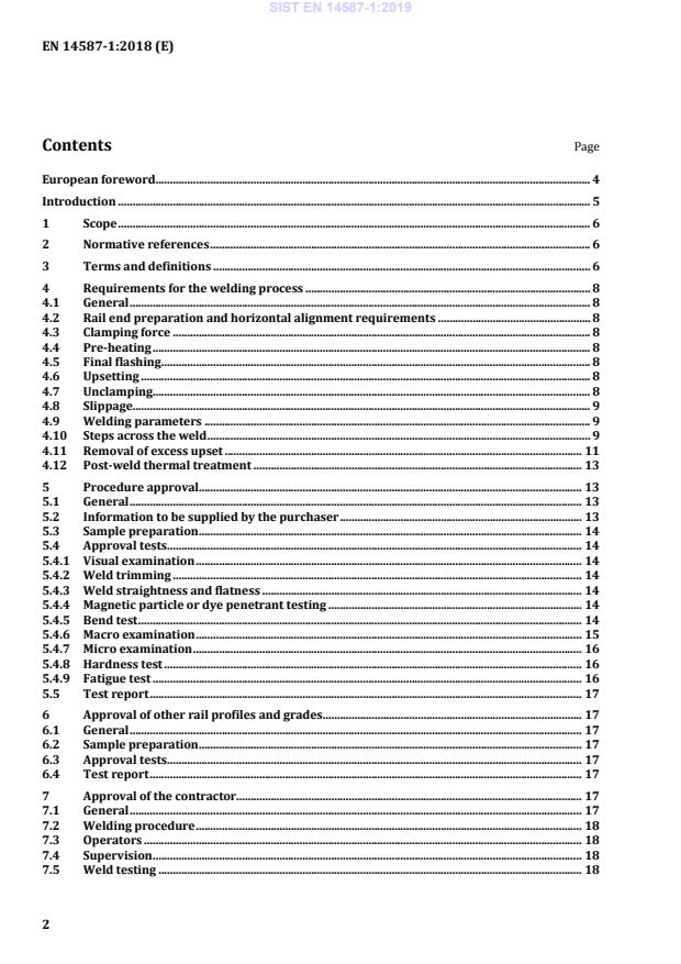 3.1 as-welded condition rails that have been welded and trimmed only 3.2 contractor company approved by a railway authority to provide staff and machinery to execute the production of flash butt welds in a fixed plant, which may include staff and machinery from within the railway authority 3.3 die burn damage caused by localized overheating (arcing) on the surface of the rail due to poor contact between the rail and electrode during welding SIST EN 14587-1:2019