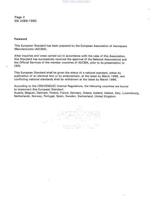 EN 2489:1995 is a standard published by the European Committee for Standardization (CEN). Its full title is "Aerospace series - Fibre reinforced plastics - Determination of the action of test fluids". This standard covers: This standard specifies the method of immersion of fibre reinforced plastics in test fluids. It does not give any directives to meet health and safety requirements. It is the responsibility of the user of this standard to adopt appropriate health and safety precautions.