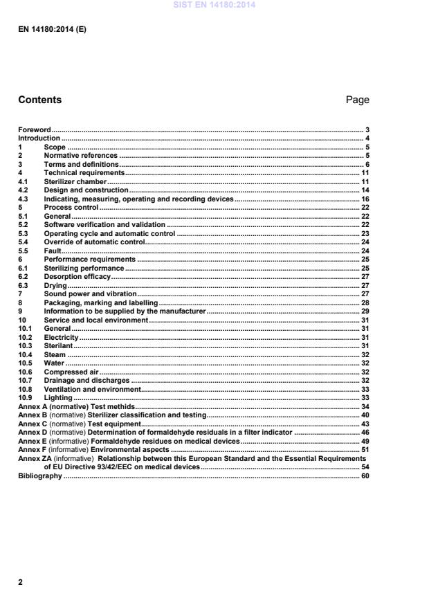 Foreword . 3 Introduction . 4 1 Scope . 5 2 Normative references . 5 3 Terms and definitions . 6 4 Technical requirements . 11 4.1 Sterilizer chamber . 11 4.2 Design and construction . 14 4.3 Indicating, measuring, operating and recording devices . 16 5 Process control . 22 5.1 General . 22 5.2 Software verification and validation . 22 5.3 Operating cycle and automatic control . 23 5.4 Override of automatic control . 24 5.5 Fault . 24 6 Performance requirements . 25 6.1 Sterilizing performance . 25 6.2 Desorption efficacy . 27 6.3 Drying . 27 7 Sound power and vibration . 27 8 Packaging, marking and labelling . 28 9 Information to be supplied by the manufacturer . 29 10 Service and local environment . 31 10.1 General . 31 10.2 Electricity . 31 10.3 Sterilant . 31 10.4 Steam . 32 10.5 Water . 32 10.6 Compressed air . 32 10.7 Drainage and discharges . 32 10.8 Ventilation and environment . 33 10.9 Lighting . 33 Annex A (normative) Test methids . 34 Annex B (normative) Sterilizer classification and testing . 40 Annex C (normative) Test equipment . 43 Annex D (normative) Determination of formaldehyde residuals in a filter indicator . 46 Annex E (informative) Formaldehyde residues on medical devices . 49 Annex F (informative) Environmental aspects . 51 Annex ZA (informative)