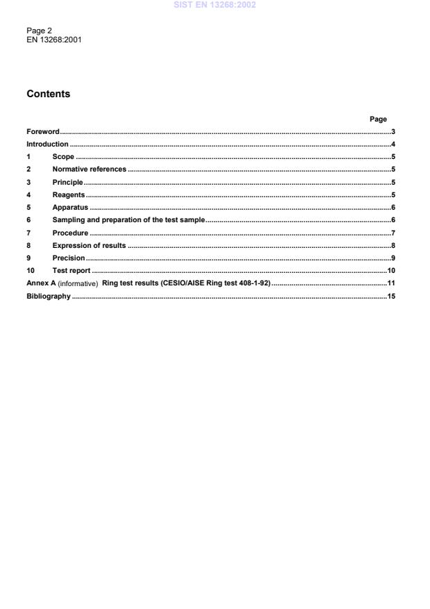 Page 2EN 13268:2001ContentsPageForeword.3Introduction.41Scope.52Normative references.53Principle.54Reagents.55Apparatus.66Sampling and preparation of the test sample.67Procedure.78Expression of results.89Precision.910Test report.10Annex A (informative)