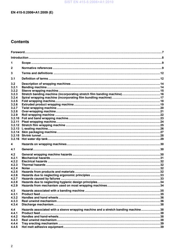 이 기사는 European Standard EN 415-5:2006+A1:2009에 대해 다루고 있다. 이 표준은 포장 기계, 특히 포장 기계에 대한 안전을 다룬다. 이 표준은 부분적으로 제품을 포장하는 기계, 밀봉 없이 완전한 포장을 형성하는 기계, 밀봉을 포함한 완전한 포장을 형성하는 기계, 이 표준에 포함된 포장 기계에 연결되는 수축 장비를 다루고 있다. 이 기사에서는 더 큰 크기의 포장 기계나 이 문서가 발표되기 전에 제조된 포장 기계는 이 표준에 포함되지 않는다고 언급하고 있다. 또한, 이 표준은 폭발 위험이 있는 환경에서 사용되는 포장 기계와 기계로 처리되는 제품에 관련된 건강, 안전 또는 위생 위험, 포장 기계로부터의 전자기 파출 등과 같은 위험을 고려하지 않는다고 밝혀져 있다. 또한, 포장 기계의 폐기에 관련된 위험도 다루지 않는다.