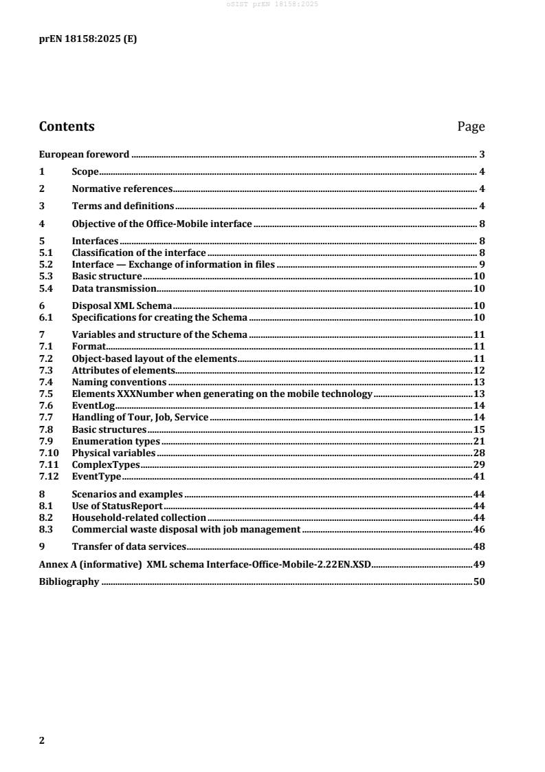 Scope and Objective: Defines digital data exchange between waste management office systems and mobile waste collection units (e.g., RCVs as per EN 1501, containers per EN 840 and EN 13071). The focus is on XML data structure, not transmission protocols.