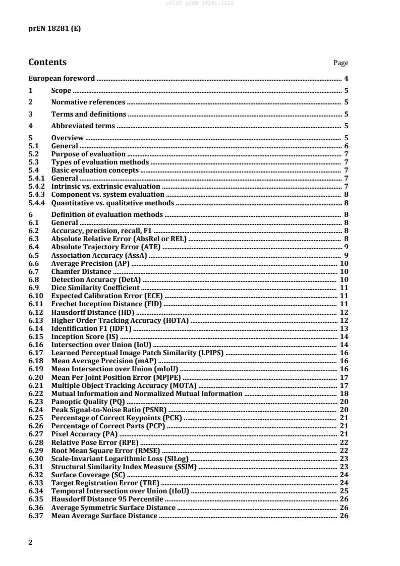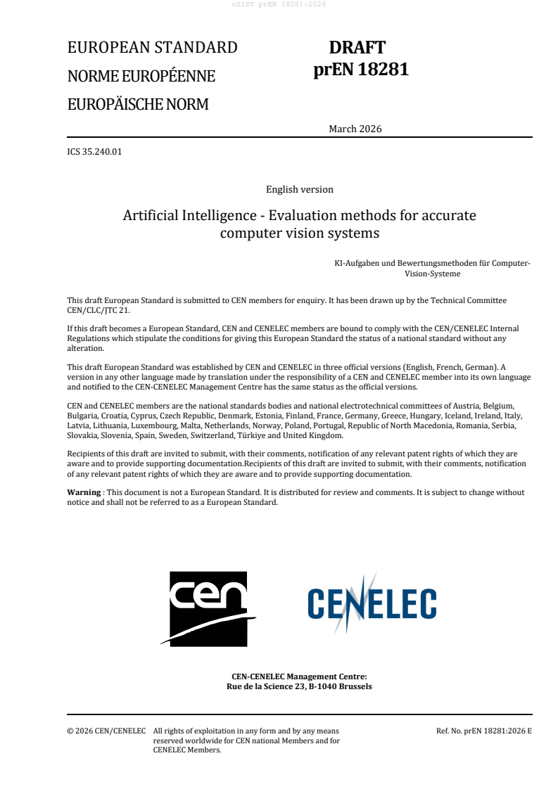 prEN 18281 is a draft published by the European Committee for Standardization (CEN). Its full title is "Artificial Intelligence - Evaluation methods for accurate computer vision systems". This standard covers: This document specifies the evaluation of computer vision systems, in the sense of measuring the quality of a system’s results to assess its functional suitability. It provides a definition of evaluation methods for those systems, together with guidance on how to select, implement and interpret those evaluation methods. This document covers quantitative metrics as well as other evaluation methods. It includes requirements on the implementation of the described metrics, and further requirements on the technical resources involved in the evaluation process.