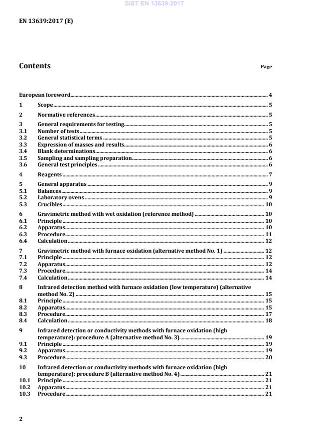 European foreword . 4 1 Scope . 5 2 Normative references . 5 3 General requirements for testing . 5 3.1 Number of tests . 5 3.2 General statistical terms . 5 3.3 Expression of masses and results . 6 3.4 Blank determinations . 6 3.5 Sampling and sampling preparation . 6 3.6 General test principles . 6 4 Reagents . 7 5 General apparatus . 9 5.1 Balances . 9 5.2 Laboratory ovens . 9 5.3 Crucibles . 10 6 Gravimetric method with wet oxidation (reference method) . 10 6.1 Principle . 10 6.2 Apparatus . 10 6.3 Procedure. 11 6.4 Calculation . 12 7 Gravimetric method with furnace oxidation (alternative method No. 1) . 12 7.1 Principle . 12 7.2 Apparatus . 12 7.3 Procedure. 14 7.4 Calculation . 14 8 Infrared detection method with furnace oxidation (low temperature) (alternative method No. 2) . 15 8.1 Principle . 15 8.2 Apparatus . 15 8.3 Procedure. 17 8.4 Calculation . 18 9 Infrared detection or conductivity methods with furnace oxidation (high temperature): procedure A (alternative method No. 3) . 19 9.1 Principle . 19 9.2 Apparatus . 19 9.3 Procedure. 20 10 Infrared detection or conductivity methods with furnace oxidation (high temperature): procedure B (alternative method No. 4) . 21 10.1 Principle . 21 10.2 Apparatus . 21 10.3 Procedure. 21 SIST EN 13639:2017