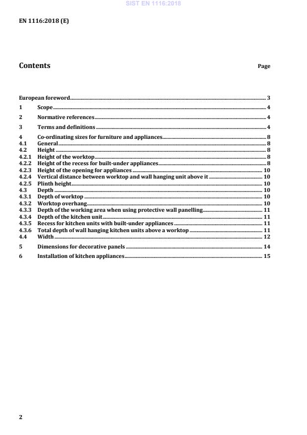 European foreword . 3 1 Scope . 4 2 Normative references . 4 3 Terms and definitions . 4 4 Co-ordinating sizes for furniture and appliances. 8 4.1 General . 8 4.2 Height . 8 4.2.1 Height of the worktop . 8 4.2.2 Height of the recess for built-under appliances . 8 4.2.3 Height of the opening for appliances . 10 4.2.4 Vertical distance between worktop and wall hanging unit above it . 10 4.2.5 Plinth height . 10 4.3 Depth . 10 4.3.1 Depth of worktop . 10 4.3.2 Worktop overhang . 10 4.3.3 Depth of the working area when using protective wall panelling. 11 4.3.4 Depth of the kitchen unit . 11 4.3.5 Recess for kitchen units with built-under appliances . 11 4.3.6 Total depth of wall hanging kitchen units above a worktop . 11 4.4 Width . 12 5 Dimensions for decorative panels . 14 6 Installation of kitchen appliances . 15