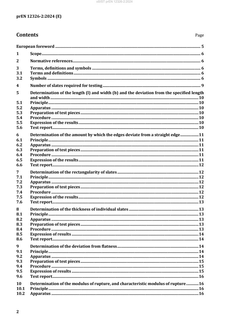 prEN 12326-2 is a draft published by the European Committee for Standardization (CEN). Its full title is "Slate and stone for discontinuous roofing and external cladding - Part 2: Test methods". This standard covers: This document specifies test methods for slate, carbonate slate, schist and schistose stone for discontinuous roofing and external cladding, as defined in 3.1, 3.2, and 3.3 of EN 12326-1:2014 and 3.1 of prEN 12326-3:2021, used for assembly into discontinuous roofs and external wall cladding. In this sense, when the test describes a slate, it could also be considered as carbonate slate.