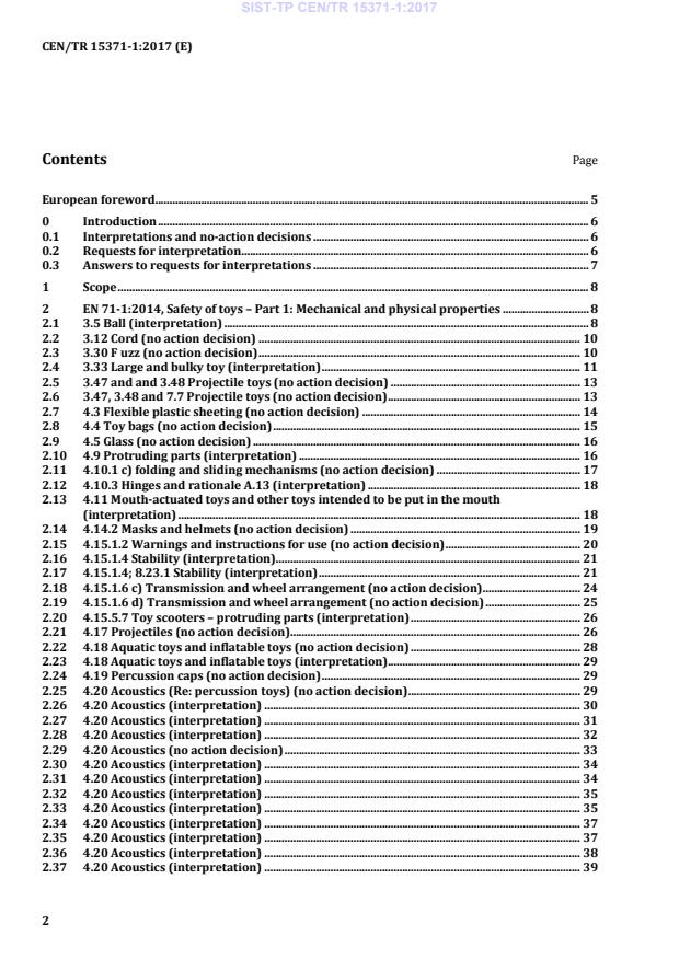 The purpose of this Technical Report is to provide replies to requests for interpretations of EN 71-1:2014, Safety of toys - Part 1: Mechanical and physical properties, EN 71-2:2011+A1:2014, Safety of toys - Part 2: Flammability, EN 71 8:2011, Safety of toys - Part 8: Activity toys for domestic use and EN 7- 14:2014, Safety of toys - Part 14: Trampolines for domestic use.