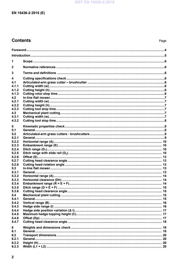 Key 1 saw blade 2 cutting width w 3 reciprocating cutter bar 4 fixed 5 mobile Figure 1 — Cutting width (w) 4.3.2 Cutting tool stop time The cutting tool stop time is measured automatically, from the time the stop command is sent to the moment when the rotation speed is measured as being equal to 0. The cutting rotor stop time is measured with an accuracy of ± 0,5 s and expressed in seconds (s). A distinction is made between the value of the stop times for open hydraulic circuits and for closed hydraulic circuits. 5 Kinematic properties check 5.1 General In their design structure, all these machines have the same constituent elements, i.e. a frame, articulated arms and a tool. Whatever the shape and size of the components and any accessories that may be used, there is always an articulation between the frame and the primary arm. The articulation which is very close to the frame is used to define three reference planes for the machine. The kinematic properties of the different machines are then defined with respect to these reference planes. See the definitions according to EN 15436-1:2008, 5.1 to 5.6. Given that the height, in relation to the ground plane of the primary arm–frame articulation changes the geometry of certain operating positions significantly, the horizontal reference plane of the machine is positioned at a height ZP from the ground specified by the manufacturer. This height can vary. SIST EN 15436-2:2015