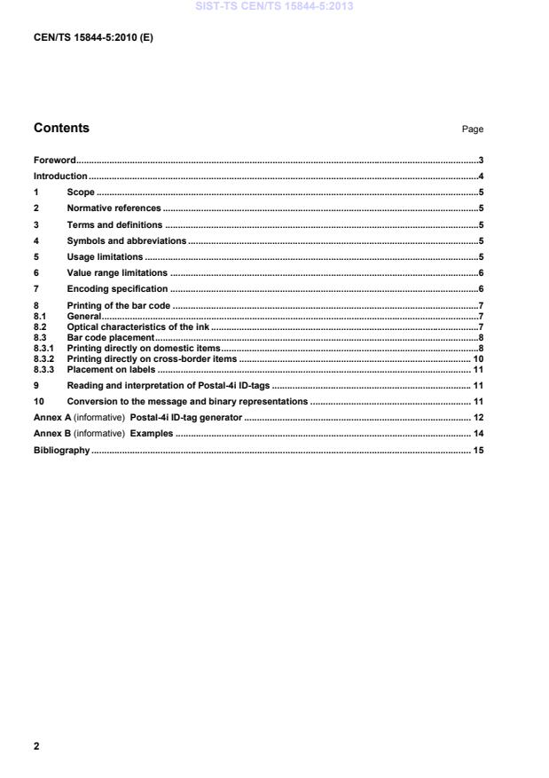 CEN/TS 15844-5:2010 is a technical specification published by the European Committee for Standardization (CEN). Its full title is "Postal services - ID-tagging of letter mail items - Part 5: 4-state encoding specification for small letters". This standard covers: This part of the Technical Specification defines the representation of ID-tags as a Postal-4i symbology 4-state bar code printed on the front side of small letters. Postal-4i symbology 4-state encoding is the only encoding specification supported by this Technical Specification ) for the printing of ID-tags on the front of items. NOTE Representation in the form of fluorescent BNB bar codes printed on the reverse side of small letters (not flats) is covered in CEN/TS 15844-2 and CEN/TS 15844-3.
