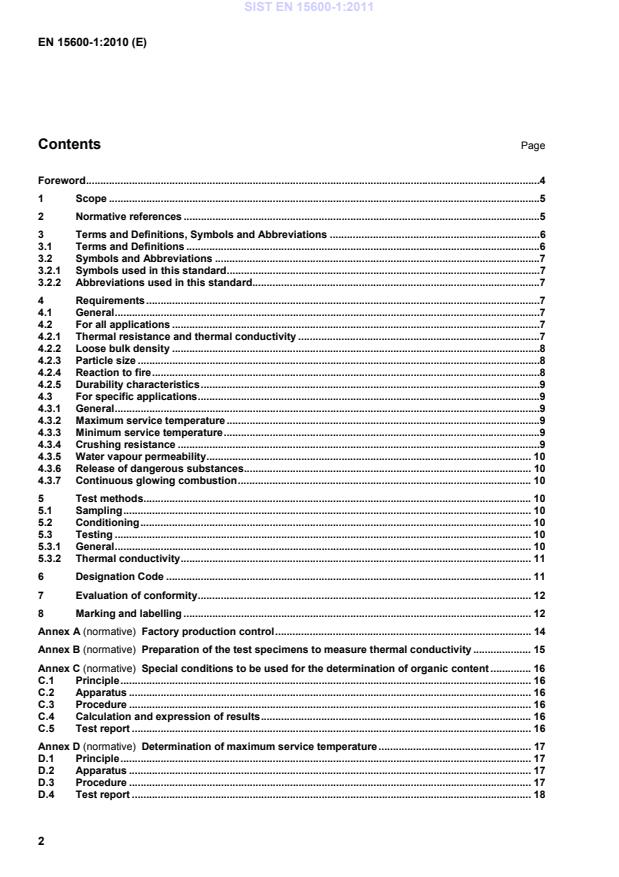 Annex C (normative) - Special conditions to be used for the determination of organic content Annex D (normative) - Determination of maximum service temperature Annex ZA (informative) - Clauses of this European Standard addressing the provisions of the EU Construction Products Directive This European Standard is one of a series for polyurethane/polyisocyanurate, expanded perlite and exfoliated vermiculite in-situ formed insulation products used in building equipment and industrial installations, but this standard may be used in other areas where appropriate. EN 14317-1 covers the use of exfoliated vermiculite in buildings. The reduction in energy used and emissions produced during the installed life of insulation products exceeds by far the energy used and emissions made during the production and disposal processes. According to the CEN/CENELEC Internal Regulations, the national standards organizations of the following countries are bound to implement this European Standard: Austria, Belgium, Bulgaria, Croatia, Cyprus, Czech Republic, Denmark, Estonia, Finland, France, Germany, Greece, Hungary, Iceland, Ireland, Italy, Latvia, Lithuania, Luxembourg, Malta, Netherlands, Norway, Poland, Portugal, Romania, Slovakia, Slovenia, Spain, Sweden, Switzerland and the United Kingdom.