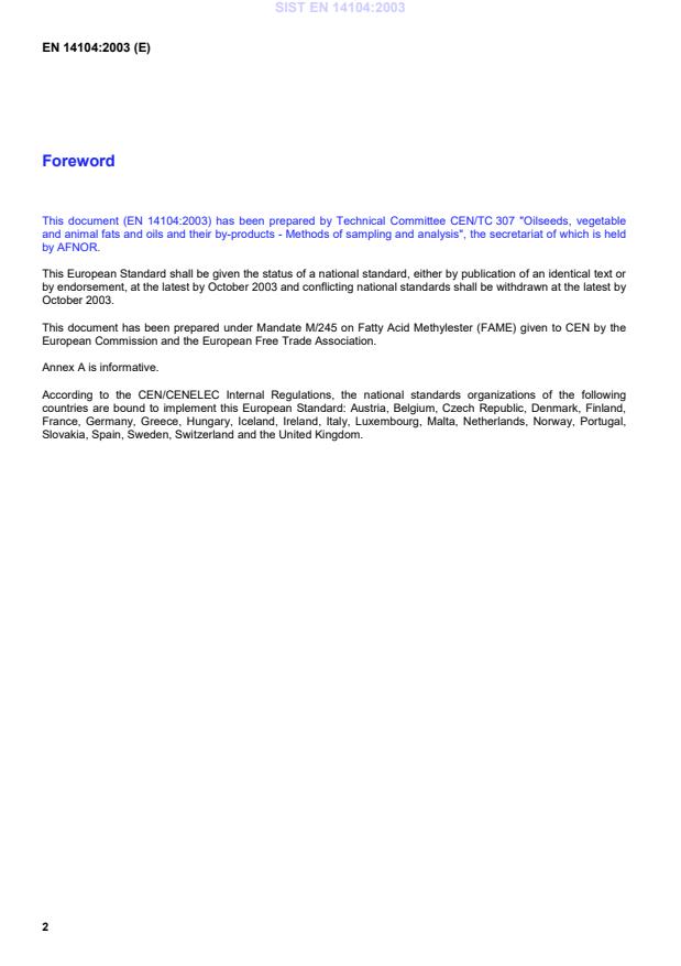 2003-01.Slovenski inštitut za standardizacijo. Razmnoževanje celote ali delov tega standarda ni dovoljeno.ORþHYDQMHErzeugnisse aus pflanzlichen und tierischen Fetten und Ölen - Fettsäure-Methylester (FAME) - Bestimmung der SäurezahlProduits dérivés des corps gras - Esters méthyliques d'acides gras (EMAG) - Détermination de l'indice d'acideFat and oil derivatives - Fatty Acid Methyl Esters (FAME) - Determination of acid value67.200.10Animal and vegetable fats and oilsICS:Ta slovenski standard je istoveten z:EN 14104:2003SIST EN 14104:2003en01-november-2003SIST EN 14104:2003SLOVENSKI