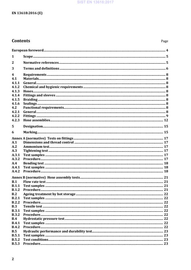Hose assembly tests . 21 B.1 Flow rate test . 21 B.1.1 Test samples . 21 B.1.2 Procedure. 21 B.2 Ageing treatment by hot storage . 22 B.2.1 Test samples . 22 B.2.2 Procedure. 22 B.3 Tensile test . 22 B.3.1 Test samples . 22 B.3.2 Procedure. 22 B.4 Hydrostatic pressure test . 22 B.4.1 Test samples . 22 B.4.2 Procedure. 22 B.5 Hydraulic performance and durability test . 23 B.5.1 Test samples . 23 B.5.2 Test conditions . 23 B.5.3 Procedure. 23 SIST EN 13618:2017