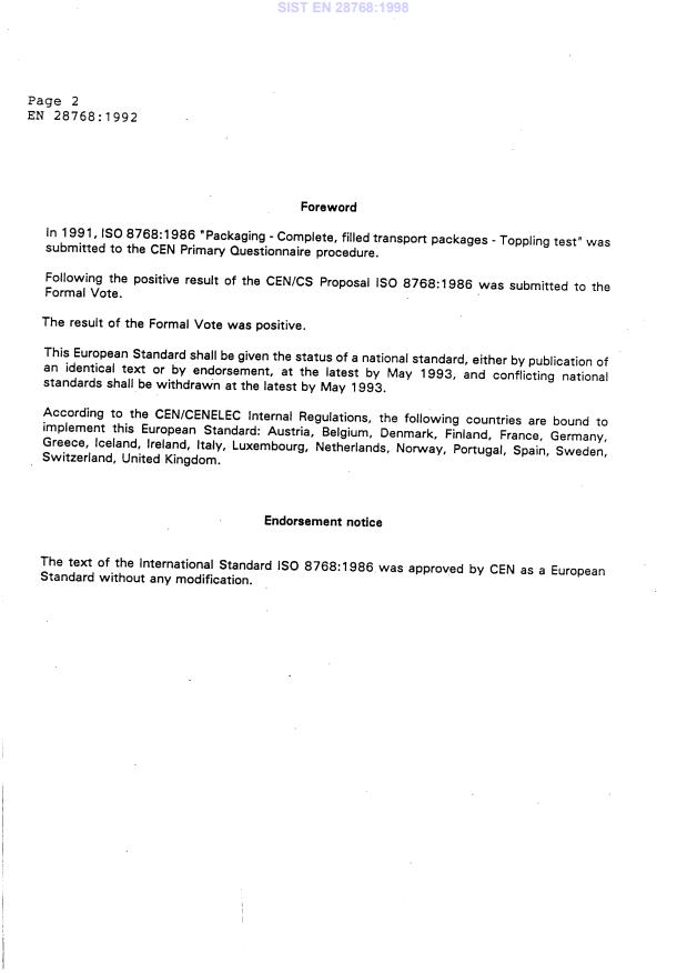 EN 28768:1992 is a standard published by the European Committee for Standardization (CEN). Its full title is "Packaging - Complete, filled transport packages - Toppling test (ISO 8768:1986)". This standard covers: This International Standard specifies a method for carrying out a toppling test on a complete, filled transport package which may be exposed to the danger of toppling during storage, transport and handling. The test may be used to assess the performance of a package in terms of its strength or the protection that it offers to its contents when it is subject to toppling. lt may be performed either as a Single test to investigate the effects of toppling or as patt of a sequence of tests designed to measure the ability of the package to withstand a distribution System that includes a toppling hazard. The test, which is complementary to the tests described in ISO 2244, ISO 2248 and ISO 2876, may be used to investigate the Performance of packages which are tall in relation to their base dimensions. lt is also applicable to packages the height of which is small by comparison with base dimensions but which may be stored or transported resting on a side face in Order to conserve storage/transport space (sec figures 1 and 2). The test is recommended for packages where the ratio of the longest to the shortest sides is of the Order of 3 : 1 or greater.