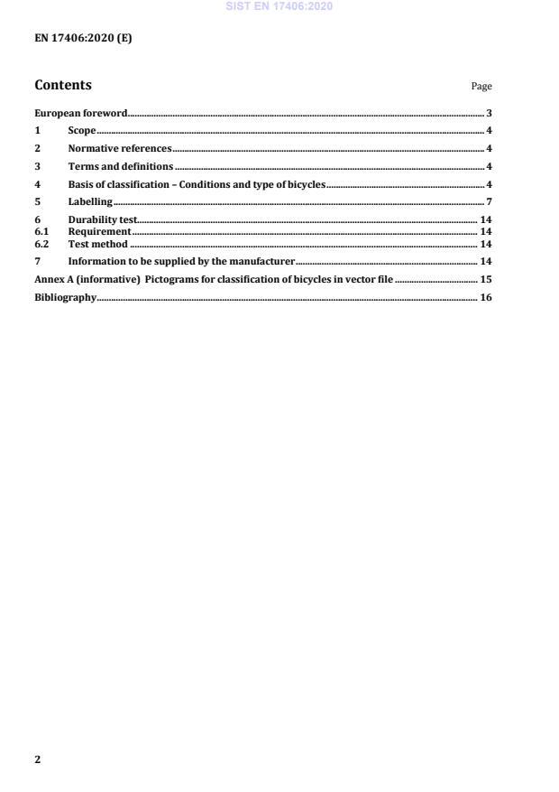 EN 17406:2020 is a standard published by the European Committee for Standardization (CEN). Its full title is "Classification for bicycles usage". This standard covers: This document defines a classification of bicycle usage conditions and it provides a method of identifying bicycles and components for use within this system. This classification gives a uniform set of usage definitions within the bicycle industry and it includes a set of graphical indicators to provide retailers and consumers with an indication of the intended use of a particular bicycle or aftermarket components.