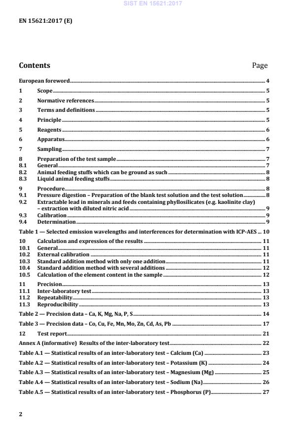 Ta evropski standard določa metodo za določevanje kalcija, natrija, fosforja, magnezija, kalija, žvepla, železa, cinka, bakra, mangana in kobalta v krmi z atomsko emisijsko spektrometrijo z induktivno sklopljeno plazmo (ICP-AES) po razklopu pod tlakom.
