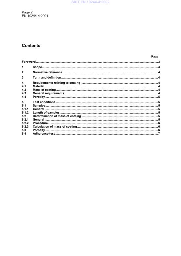 Page 2EN 10244-4:2001ContentsPageForeword.31Scope.42Normative reference.43Term and definition.44Requirements relating to coating.44.1Material.44.2Mass of coating.44.3General requirements.44.4Porosity.55Test conditions.55.1Samples.55.1.1General.55.1.2Length of samples.55.2Determination of mass of coating.55.2.1General.55.2.2Procedure.65.2.3Calculation of mass of coating.65.3Porosity.65.4Adherence test.7SIST EN 10244-4:2002