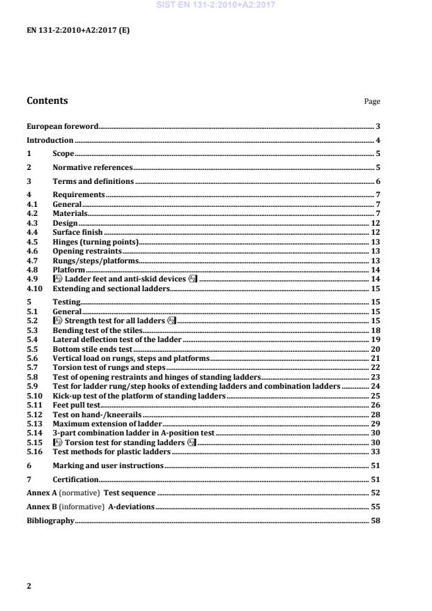 EN 131-2:2010+A2:2017 is a standard published by the European Committee for Standardization (CEN). Its full title is "Ladders - Part 2: Requirements, testing, marking". This standard covers: This European Standard specifies the general design features, requirements and test methods for portable ladders. It does not apply to step stools or ladders for specific professional use such as firebrigade ladders, roof ladders and mobile ladders. It does not apply to ladders used for work on or near live electrical systems or installations. For this purpose EN 61478 applies. NOTE For insulating ladders for use on or near low voltage electrical installations EN 50528 applies. This European Standard is intended to be used in conjunction with EN 131 1. For single or multiple hinge joint ladders EN 131 4 applies. For telescopic ladders EN 131-6 applies. For mobile ladders with a platform EN 131 7 applies.