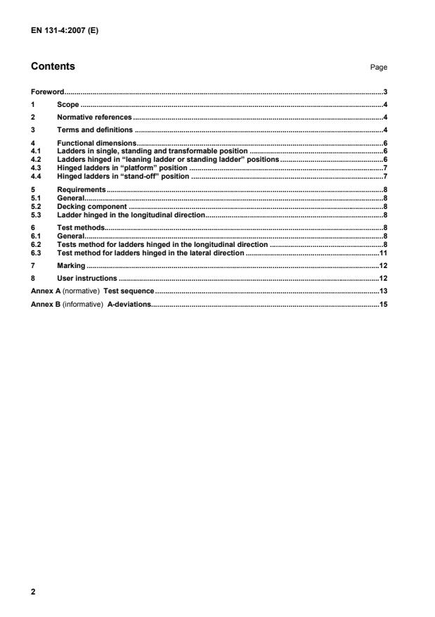 3 Foreword This document (EN 131-4:2007) has been prepared by Technical Committee CEN/TC 93 “Ladders”, the se-cretariat of which is held by DIN. This European Standard shall be given the status of a national standard, either by publication of an identical text or by endorsement, at the latest by November 2007, and conflicting national standards shall be with-drawn at the latest by November 2007. This European Standard is one of a series about ladders. Other standards of this series are listed in Clause 2. According to the CEN/CENELEC Internal Regulations, the national standards organizations of the following countries are bound to implement this European Standard: Austria, Belgium, Bulgaria, Cyprus, Czech Re-public, Denmark, Estonia, Finland, France, Germany, Greece, Hungary, Iceland, Ireland, Italy, Latvia, Lithuania, Luxembourg, Malta, Netherlands, Norway, Poland, Portugal, Romania, Slovakia, Slovenia, Spain, Sweden, Switzerland and United Kingdom.