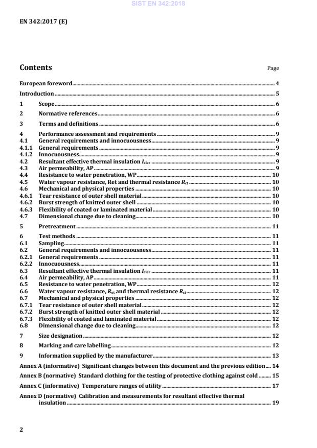 - Normative references and annexes - Includes links to test methods (e.g., EN ISO 15831 thermal manikin, EN ISO 11092 sweating guarded‑hotplate) and informative annexes such as temperature range guidance (Annex C).