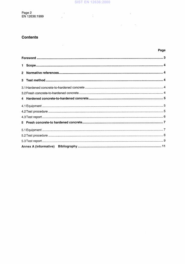 EN 12636:1999 (adopted as SIST EN 12636:2000) is a European Standard published by CEN that specifies test methods for determining the adhesion of concrete to concrete. It covers procedures to measure the bond strength of structural bonding agents used when placing fresh concrete onto a hardened concrete substrate or when joining hardened repair mortars/overlays to existing concrete. The standard is intended for products and systems for the protection and repair of concrete structures.