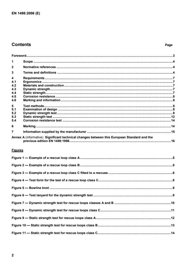 Figures Figure 1 — Example of a rescue loop class A.5 Figure 2 — Example of a rescue loop class B.5 Figure 3 — Example of a rescue loop class C fitted to a rescuee.6 Figure 4 — Test form for the test of a rescue loop class C.8 Figure 5 — Bowline knot.9 Figure 6 — Test lanyard for the dynamic strength test.9 Figure 7 — Dynamic strength test for rescue loops classes A and B.10 Figure 8 — Dynamic strength test for rescue loops class C.11 Figure 9 — Static strength test for rescue loops class A.12 Figure 10 — Static strength test for rescue loops class B.13 Figure 11 — Static strength test for rescue loops class C.14