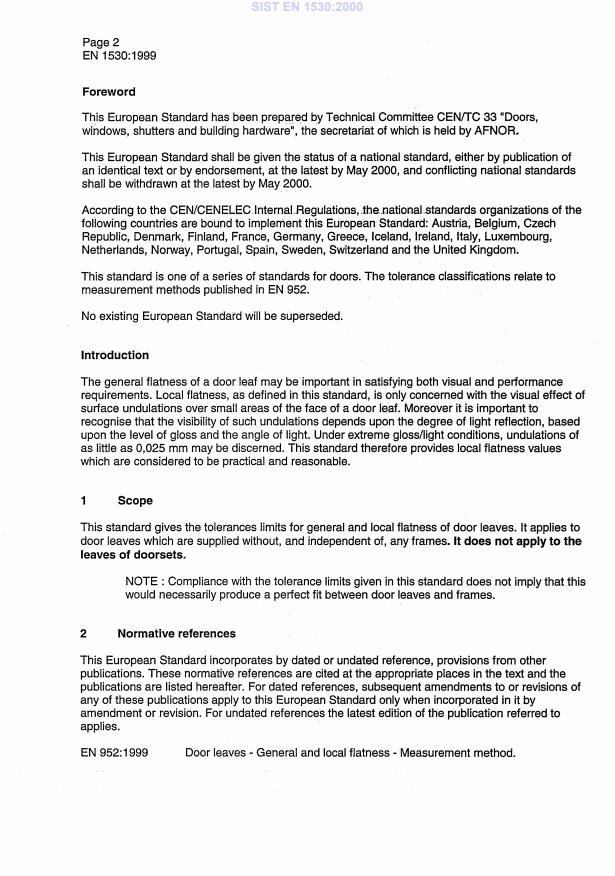 EN 1530:1999 is a standard published by the European Committee for Standardization (CEN). Its full title is "Door leaves - General and local flatness - Tolerance classes". This standard covers: This standard gives the tolerances limits for general and local flatness of door leaves. It applies to door leaves which are supplied without, and independent of, any frames. It does not apply to the leaves of doorsets. NOTE: Compliance with the tolerance limits given in this standard does not imply that this would necessarily produce a perfect fit between door leaves and frames.