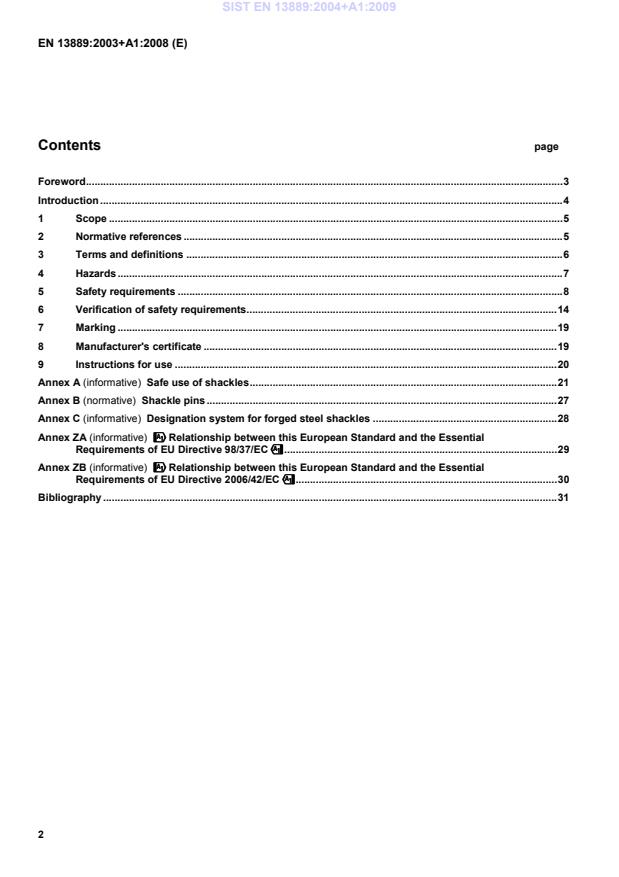 EN 13889:2003+A1:2008 is the CEN European safety standard for forged steel Dee and bow shackles (Grade 6) used for general lifting purposes. It covers shackles with threaded pins and specifies requirements for design, materials, manufacturing, testing, marking and documentation for working load limits (WLL) from 0.5 t to 25 t. Annex A gives guidance on safe use, Annex B (normative) details pin types, and Annex C provides an example designation system. The standard supports conformity with the EU Machinery Directives (see informative annexes ZA/ZB).