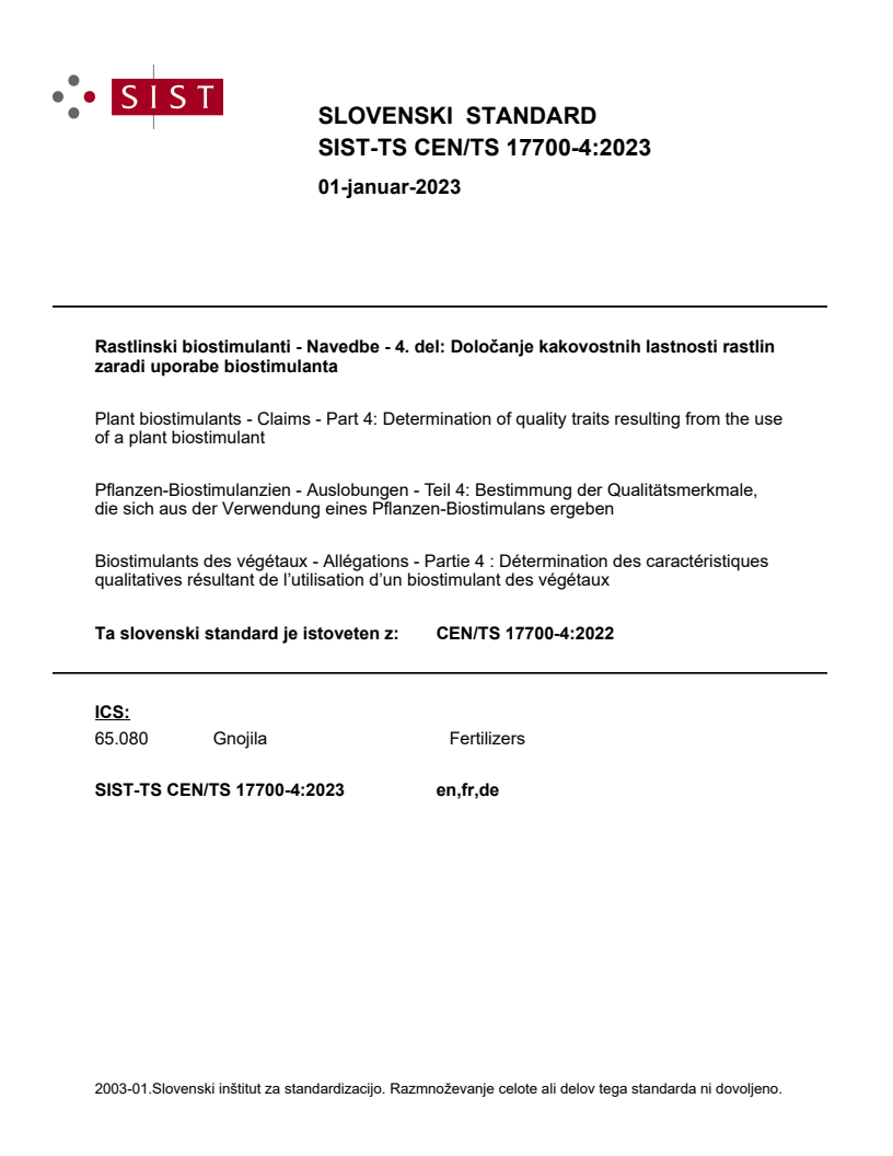 CEN/TS 17700-4:2022 is a technical specification published by the European Committee for Standardization (CEN). Its full title is "Plant biostimulants - Claims - Part 4: Determination of quality traits resulting from the use of a plant biostimulant". This standard covers: This document provides guidance for justifying quality traits claims of plant biostimulants used in agriculture. This document is aimed primarily at manufacturers, laboratories, companies which will put the products on the market, notifying authorities, notified bodies, and market surveillance authorities.