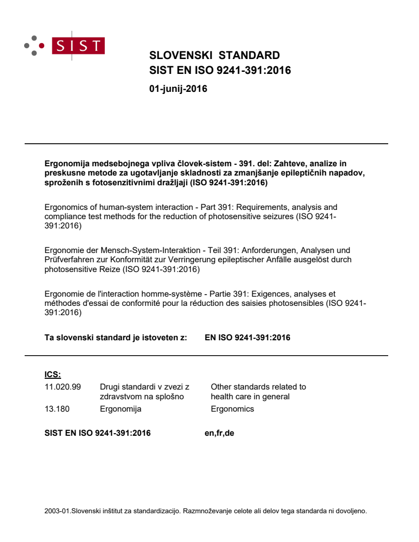Ergonomics of human-system interaction - Part 391: Requirements, analysis and compliance test methods for the reduction of photosensitive seizures (ISO 9241-391:2016)