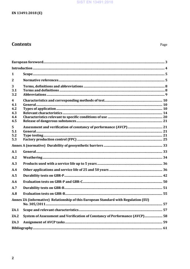 Durability of geosynthetic barriers . 33 A.1 General . 33 A.2 Weathering . 34 A.3 Products used with a service life up to 5 years . 36 A.4 Other applications and service life of 25 and 50 years . 36 A.5 Durability tests on GBR-P . 42 A.6 Evaluation tests on GBR-P and GBR-C . 50 A.7 Durability tests on GBR-B . 51 A.8 Evaluation tests on GBR-B . 55 Annex ZA (informative)