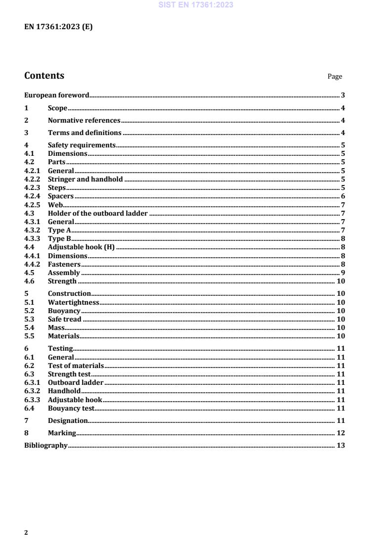 Keywords: EN 17361:2023, outboard ladders, inland navigation vessels, safety requirements, strength test, buoyancy, adjustable hook, Type A, Type B, CEN.