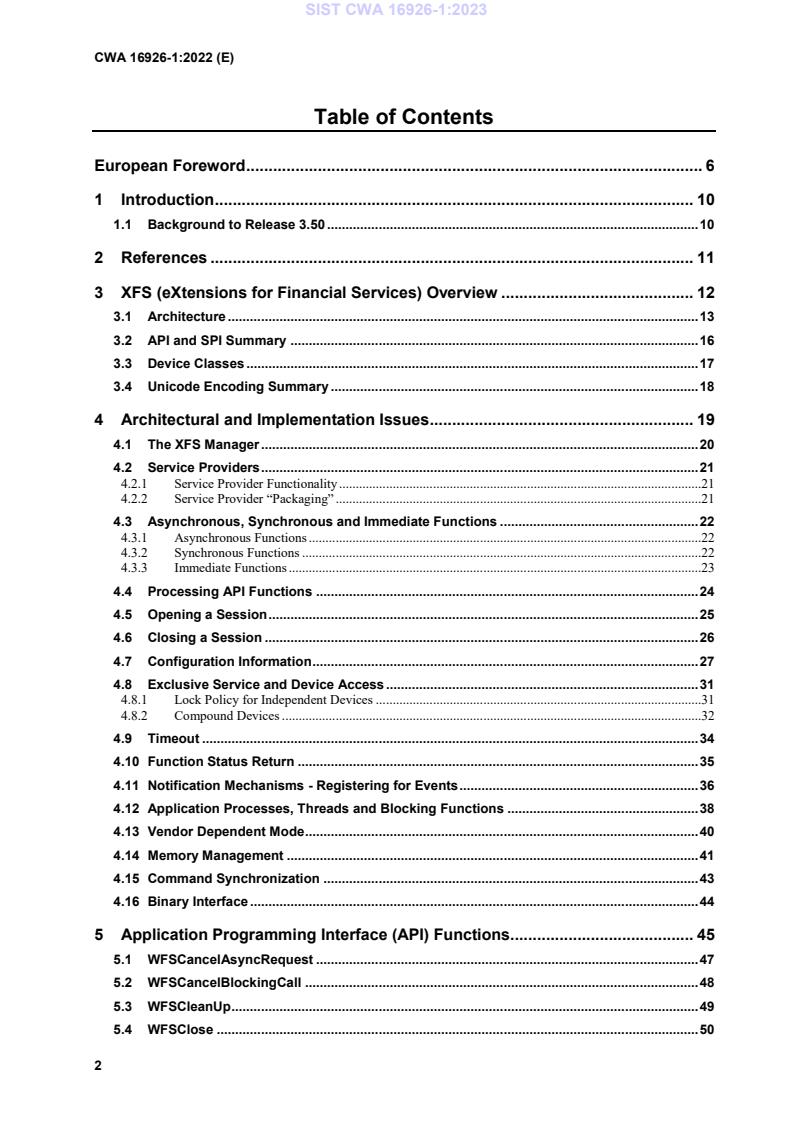 CWA 16926-1:2022 - Extensions for Financial Services (XFS) interface specification Release 3.50, Part 1: Programmer's Reference - defines the architecture, Application Programming Interfaces (API) and Service Provider Interfaces (SPI) that enable Windows‑based applications to access financial services and peripheral devices. The specification standardizes a set of interfaces so applications written to the XFS API can interoperate with different conformant service providers without code changes. The document also covers supporting services, configuration, messaging, error handling and end‑to‑end (E2E) authentication.