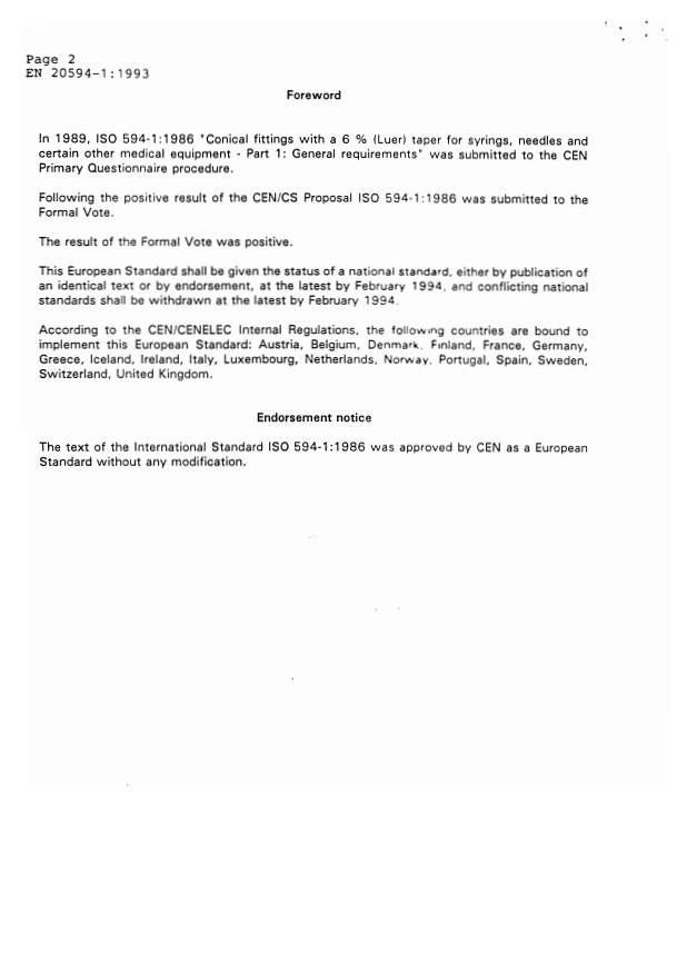 EN 20594-1:1993 is a standard published by the European Committee for Standardization (CEN). Its full title is "Conical fittings with a 6% (Luer) taper for syringes, needles and certain other medical equipment - Part 1: General requirements (ISO 594-1:1986)". This standard covers: Specification of the requirements for conical (Luer) fittings for use with hyperdemic syringes and needles and with certain other apparatus for medical use such as transfusion and infusion sets. It covers fittings made of rigid and semi-rigid materials and includes test methods for gauging and performance. It excludes provision for more flexible or elastomeric materials. The annex on liquid leakage is given as an example.