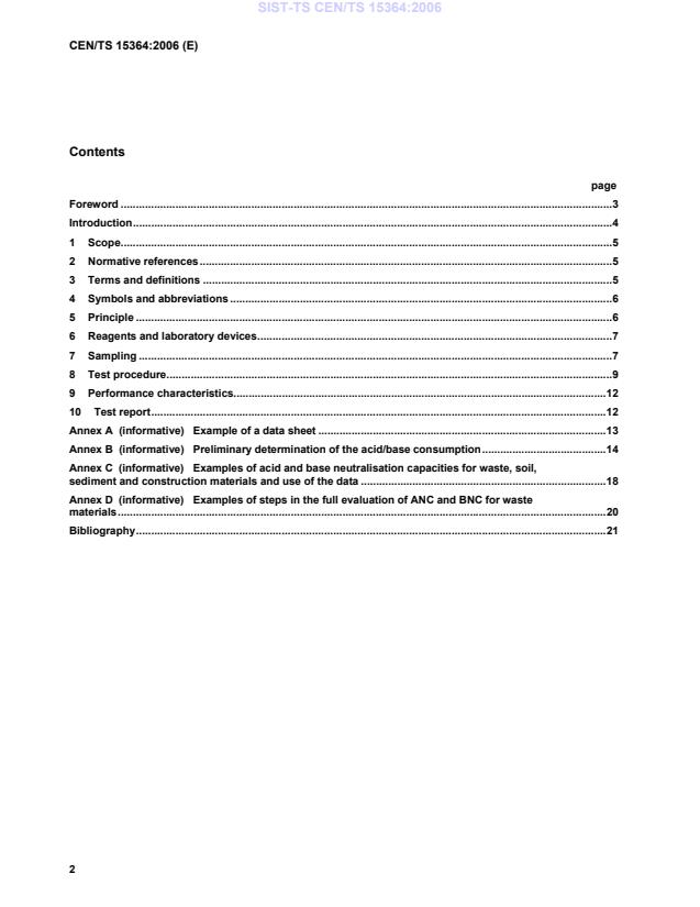 CEN/TS 15364:2006 is a technical specification published by the European Committee for Standardization (CEN). Its full title is "Characterization of waste - Leaching behaviour tests - Acid and base neutralization capacity test". This standard covers: This Technical Specification is applicable to determine the acid and/or base neutralization capacity of a material. The property is expressed in mol/kg. This Technical Specification is a parameter specific test as specified in EN 12920. The application of this test method alone is not sufficient for the determination of the detailed leaching behaviour of a waste under specified conditions. The property allows assessing the final pH of mixed waste as well as consequences of external influences (carbonation, oxidation) on the pH of a waste. NOTE This generally requires the application of several test methods, behavioral modeling and model validation as specified in EN 12920.