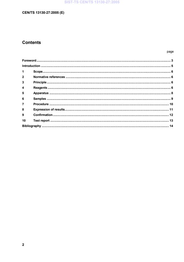 CEN/TS 13130-27:2005 is a technical specification published by the European Committee for Standardization (CEN). Its full title is "Materials and articles in contact with foodstuffs - Plastics substances subject to limitation - Part 27: Determination of 2,4,6-triamino-1,3,5-triazine in food simulants". This standard covers: This document, part of EN 13031,13130, specifies an analytical procedure for the determination of 2,4,6-triamino-1,3,5-triazine in food simulants distilled water, 3 % (w/v) acetic acid aqueous solution, 15% (v/v) ethanol aqueous solution and rectified olive oil. The level of 2,4,6-triamino-1,3,5-triazine monomer determined is expressed as milligrams per kilogram food simulant. The method is appropriate for the quantitative determination of 2,4,6-triamino-1,3,5-triazine in approximate analyte concentration range of 2 mg/kg to 60 mg/kg food simulant. NOTE The method should also be applicable to other aqueous food simulants as well as to the other fatty food simulants e.g. sunflower oil, corn oil or a mixture of synthetic triglycerides.