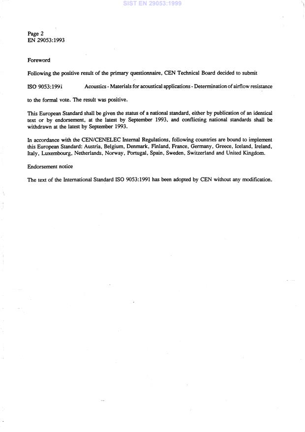 EN 29053:1993 is a standard published by the European Committee for Standardization (CEN). Its full title is "Acoustics - Materials for acoustical applications - Determination of airflow resistance (ISO 9053:1991)". This standard covers: The standard specifies two methods for the determination of the airflow resistance of porous materials for acoustical applications